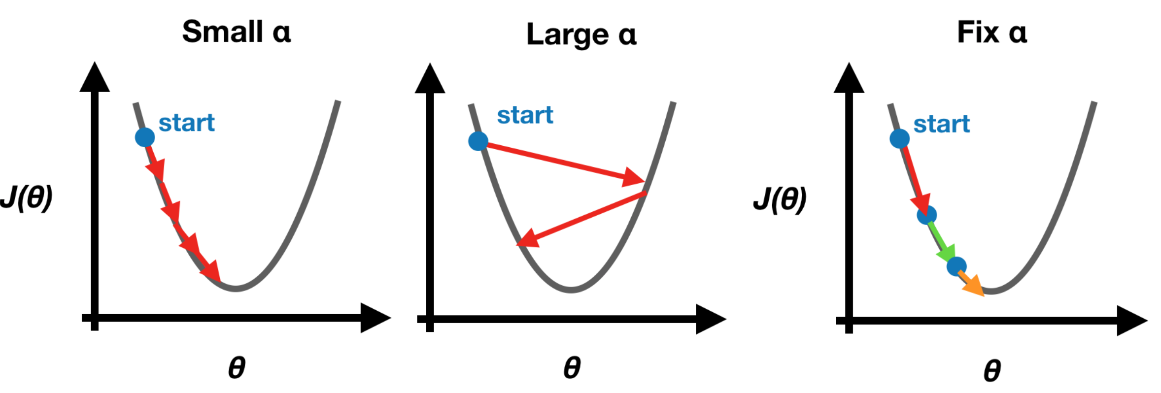 We use learning rate α to control how much we update at one iteration. If α is too small, it makes the gradient descent update too slow, whereas the update may overshoot the minimum and won’t converge. Note that we set a fixed learning rate α in the beginning since the gradient descent will update slowly and automatically until it reaches the minimum. Hence, there is no need to change the learning rate α at each iteration by ourselves.